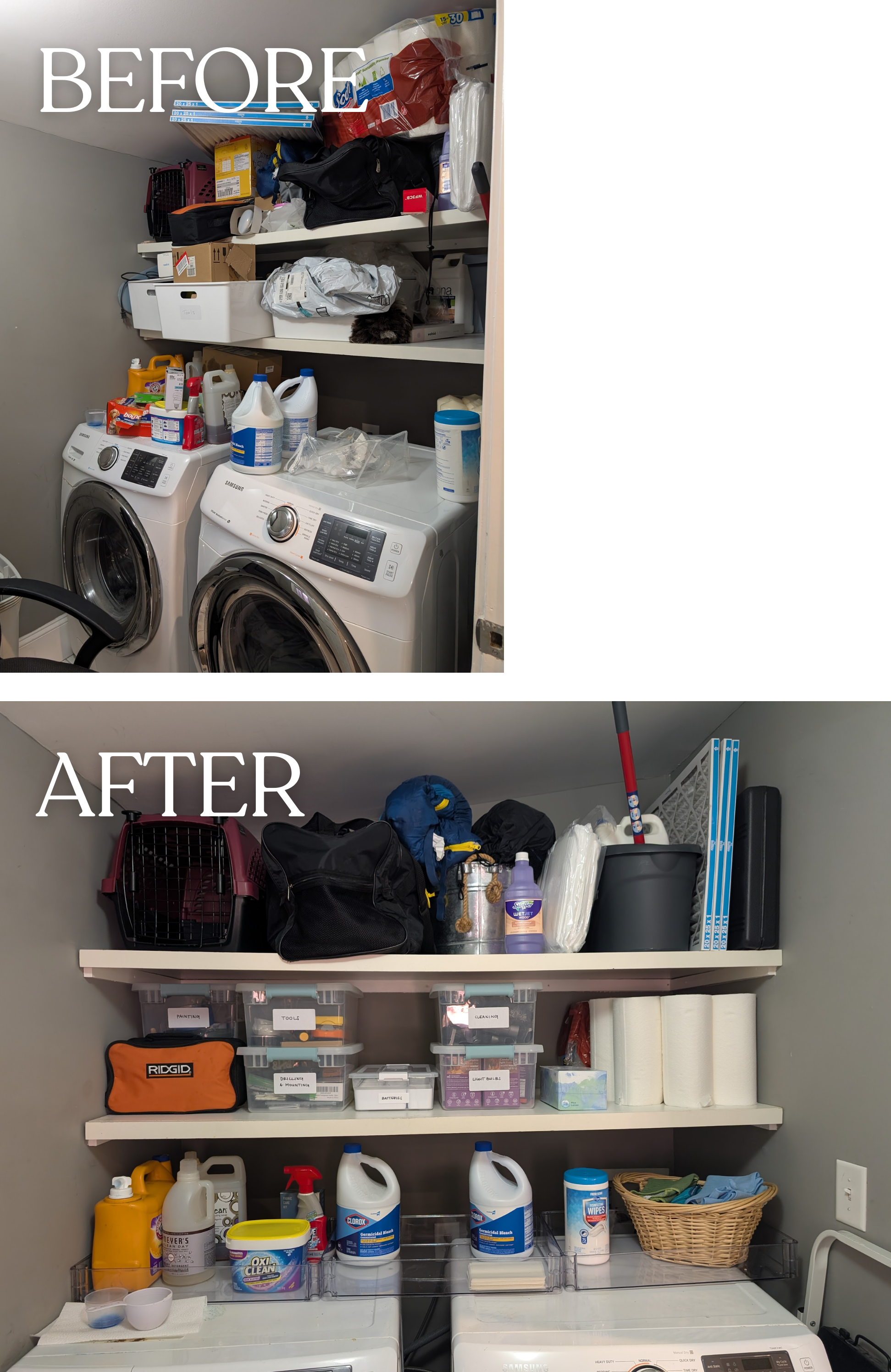 Her laundry room had deep shelving — a great asset, but the large, heavy bins weren’t practical.