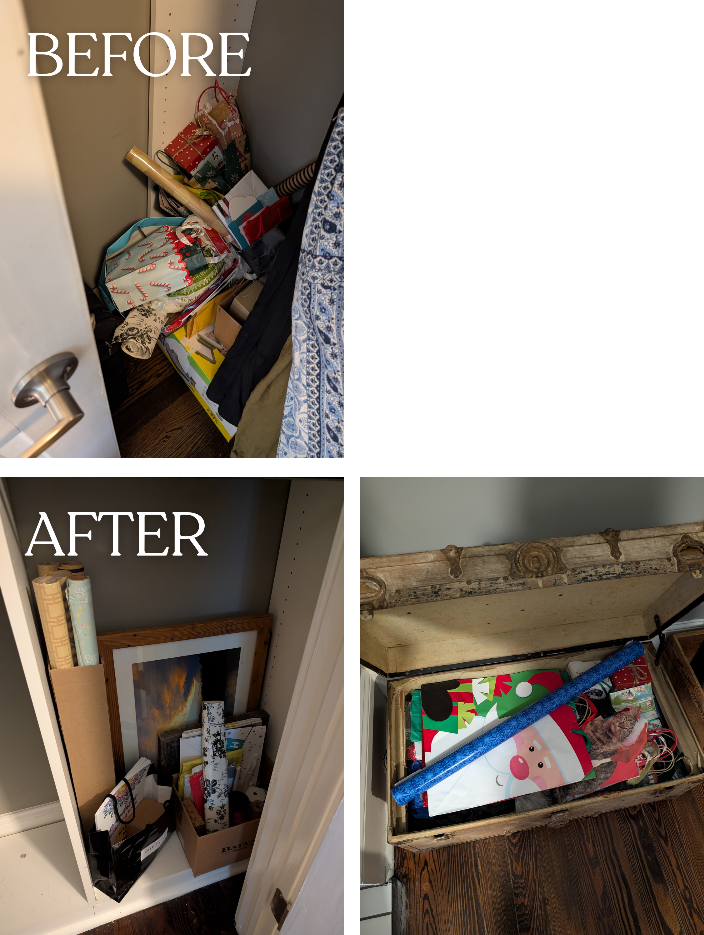 What we did: After paring everything down to what she actually enjoys using, we relocated the items to a guest room closet. We also repurposed a decorative trunk to store holiday items in a way that felt special and functional.